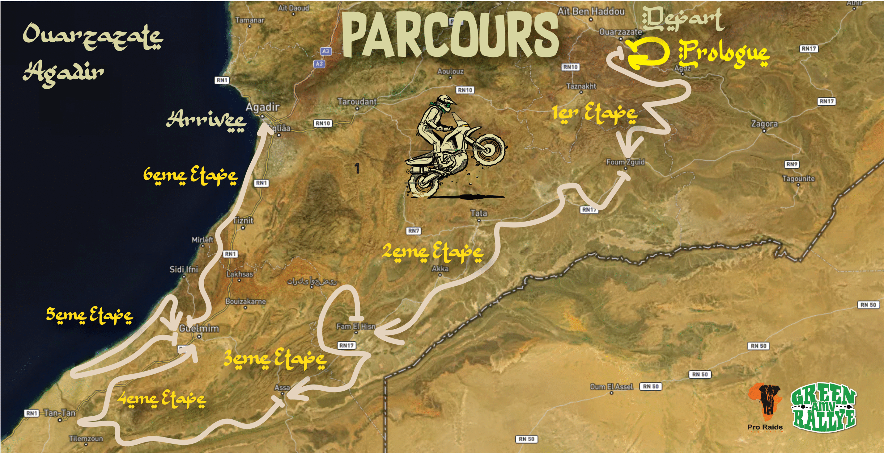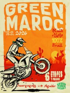 Bienvenue sur l’AMV Green Rallye, le tout premier raid moto au Maroc exclusivement réservé aux trails de 300 à 1300 cm³. Pendant 7 jours d’aventure, dont 1 prologue et 6 étapes, une étape-marathon avec bivouac dans un chott.