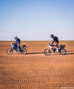Au départ de Ouarzazate, porte du Sahara, les pistes fileront plein sud avant de bifurquer sud-ouest en longeant (à bonne distance) la frontière algérienne, puis de mettre le cap sur l’Océan, et sa célèbre Plage Blanche ou faisait halte Saint-Exupéry, avant de remonter sur Agadir, arrivée de notre raid.