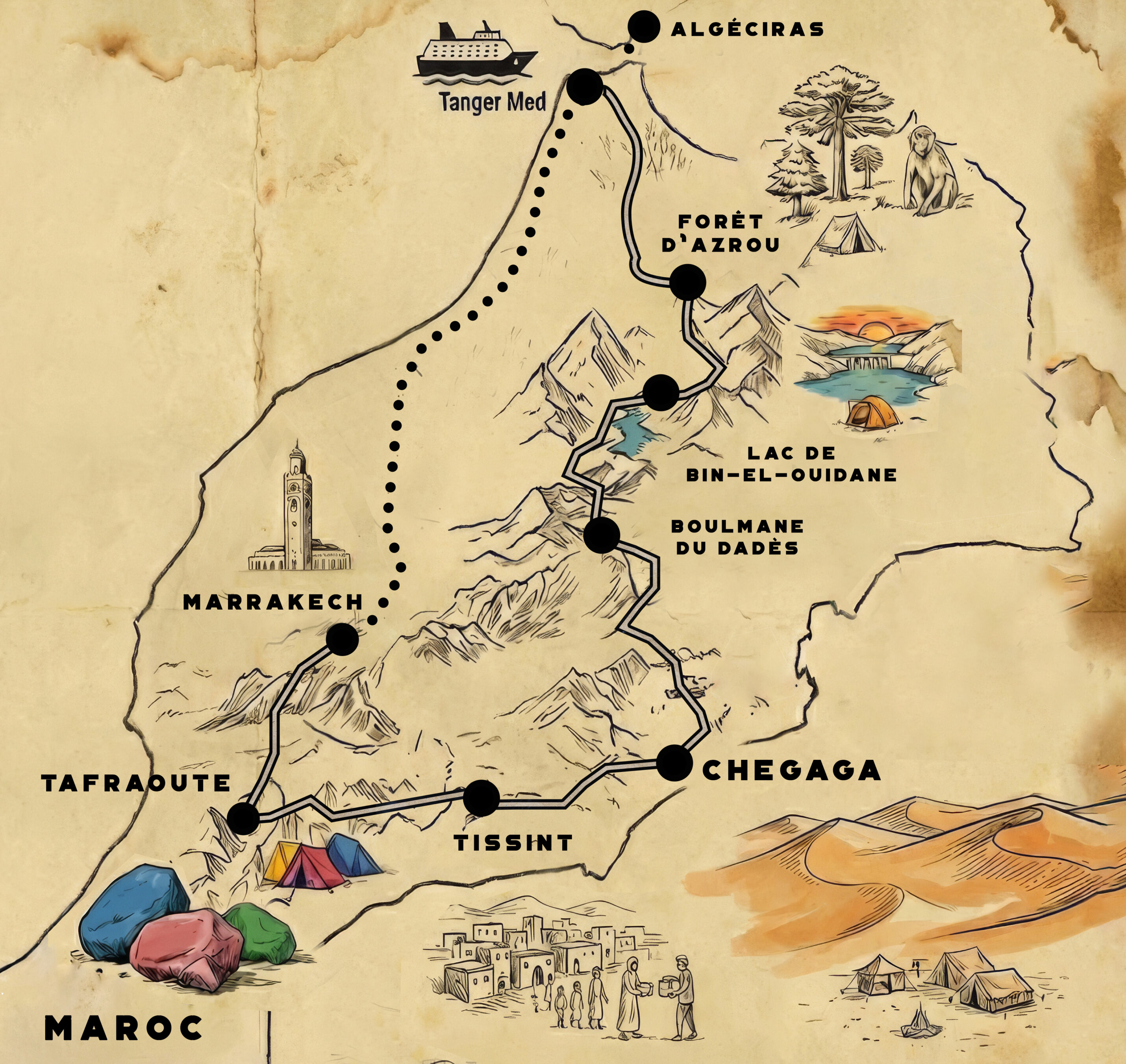 Pas de routine ! 2 700 km de traversée du Maroc, du nord au sud, des forêts de cèdres aux dunes ocres de Chegaga, en passant par les cols du Haut-Atlas et les Gorges du Dadès.